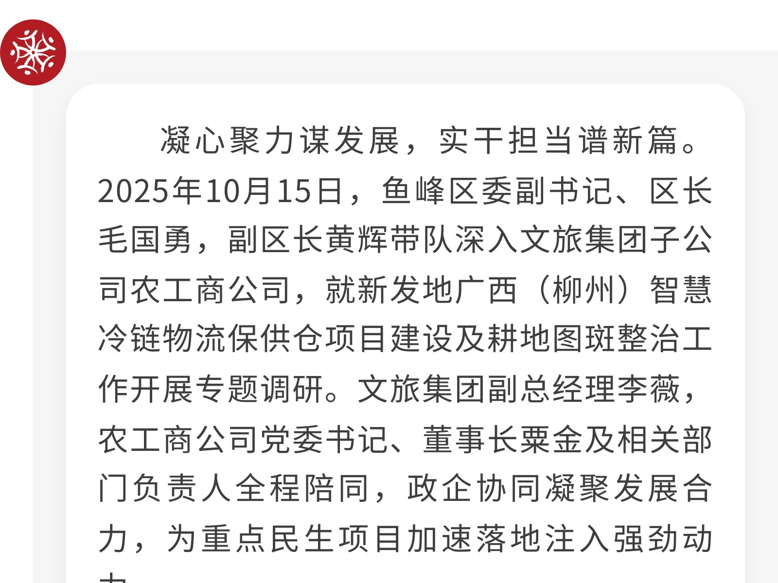 魚峰區(qū)政府主要領(lǐng)導(dǎo)深入調(diào)研指導(dǎo) 文旅集團(tuán)農(nóng)工商公司全力推進(jìn)重點(diǎn)民生項(xiàng)目落地 發(fā)布時(shí)間:2025年10月16日 09時(shí)來源:本站原創(chuàng)瀏覽:31 人次