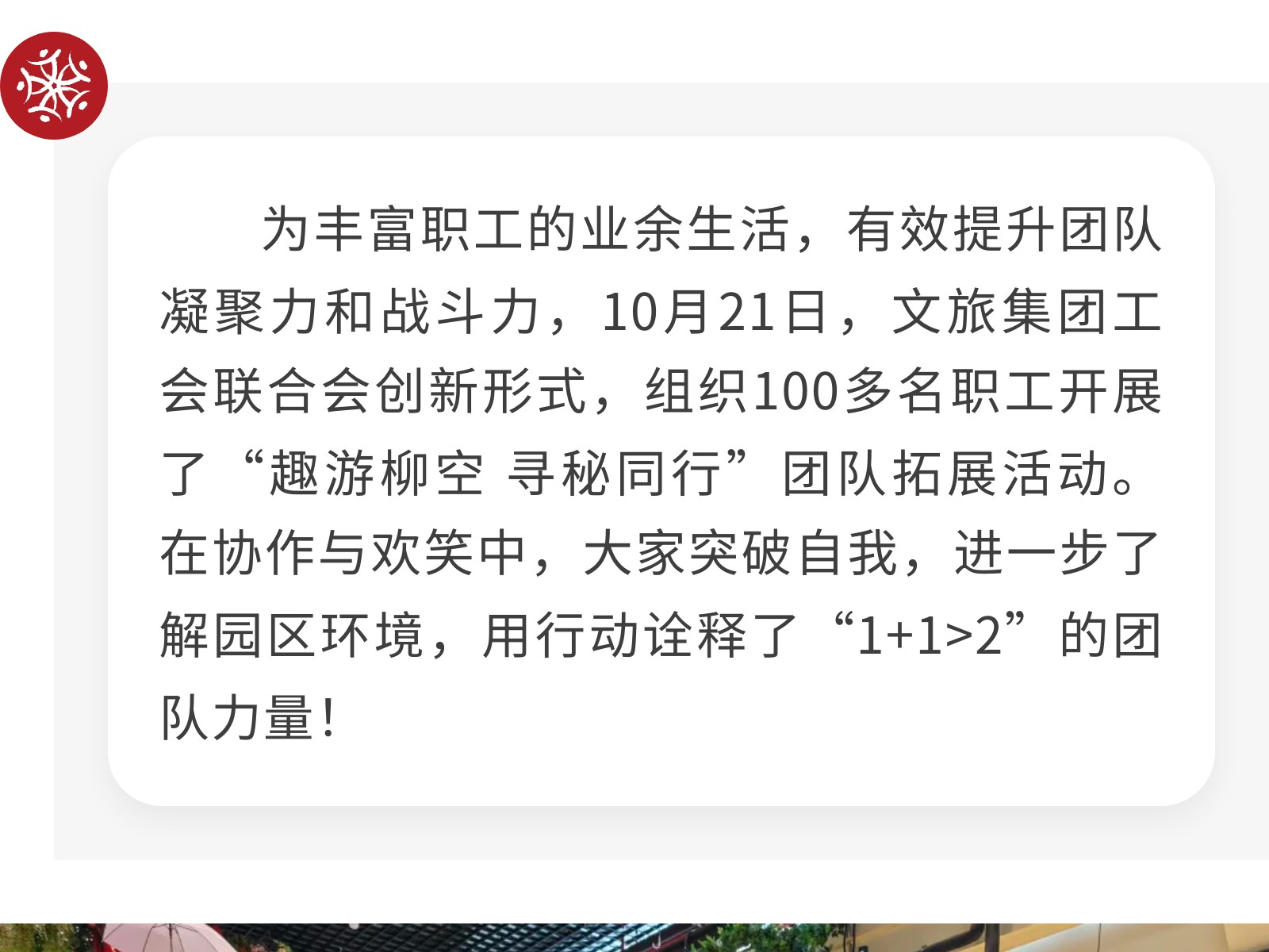 趣游柳空,尋秘同行!文旅集團開展團隊拓展活動,玩出滿滿凝聚力 發(fā)布時間:2025年10月23日 10時來源:本站原創(chuàng)瀏覽:21 人次